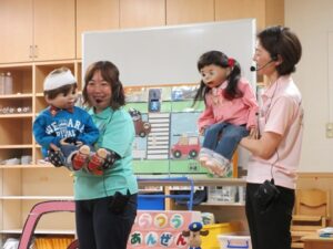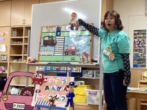 絵カードやパネル、腹話術を使ったお話で、楽しく交通ルールを学ぶことができました♪