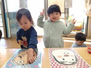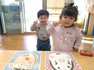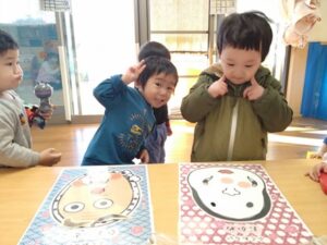お友達と会話を楽しみながら福笑い遊びをしました♪