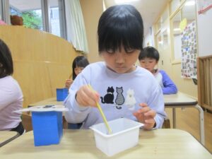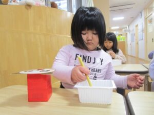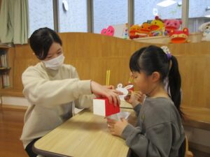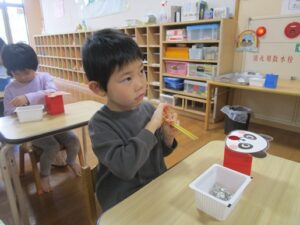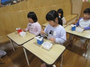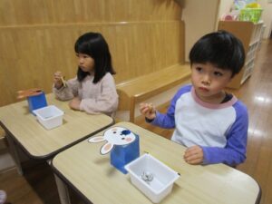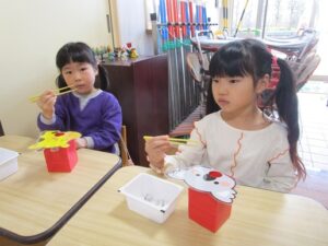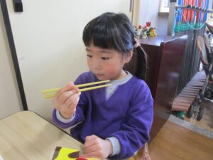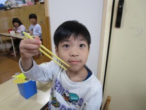 今月はきりん組さんと正しいお箸の持ち方の練習をしました。