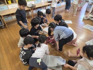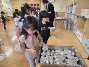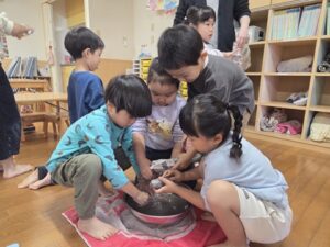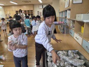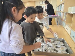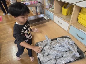 今月の食育はきりん・ぱんだ組さんと焼き芋作りをしました♪